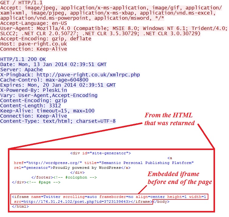 - Clean-MX: reported on 2014-01-13 01:51:16 UTC - http://pave-right[.]co[.]uk/ - JS/iFrame.EXP.4