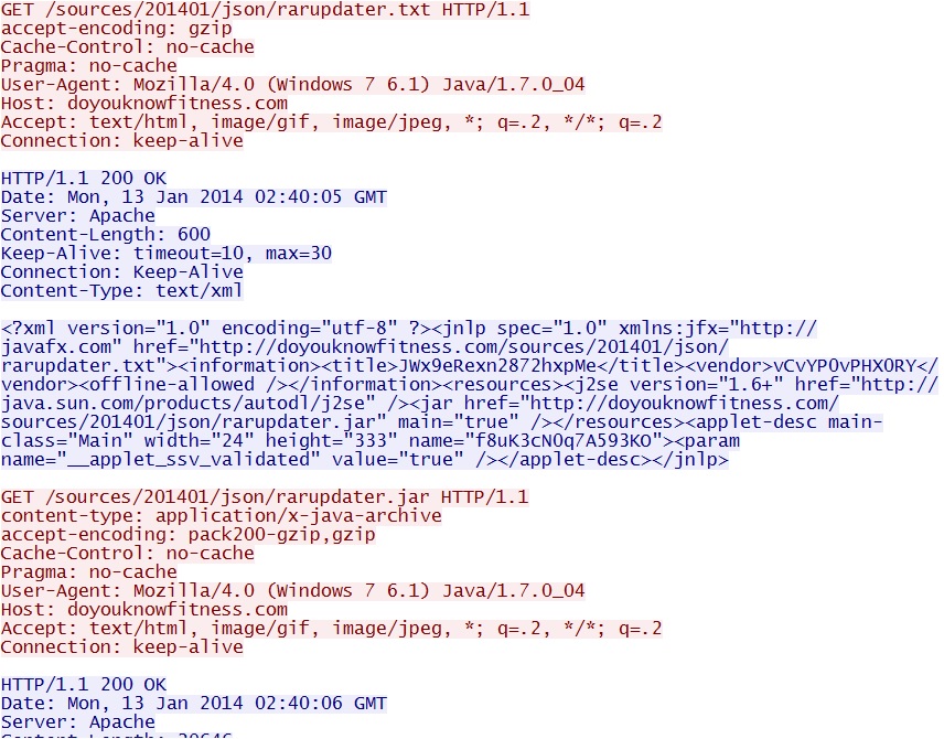 - 20:40:06 CST - 66.147.244[.]98:80 - doyouknowfitness[.]com - GET /sources/201401/json/rarupdater.jar