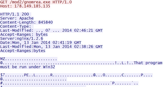 - 20:41:28 CST - 78.27.175[.]127:80 - no domain name - GET /mod1/gnomrea.exe