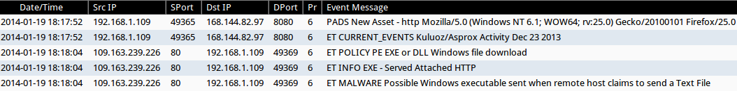 - 18:17:52 UTC - 168.144.82[.]97 port 80 - PADS New Asset - http Mozilla/5.0 (Windows NT 6.1; WOW64; rv:25.0) Gecko/20100101 Firefox/25.0