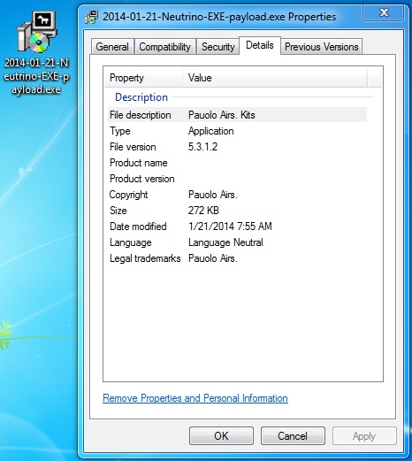 File name: 2014-01-21-Neutrino-EXE-payload.exe File size: 278,729 bytes