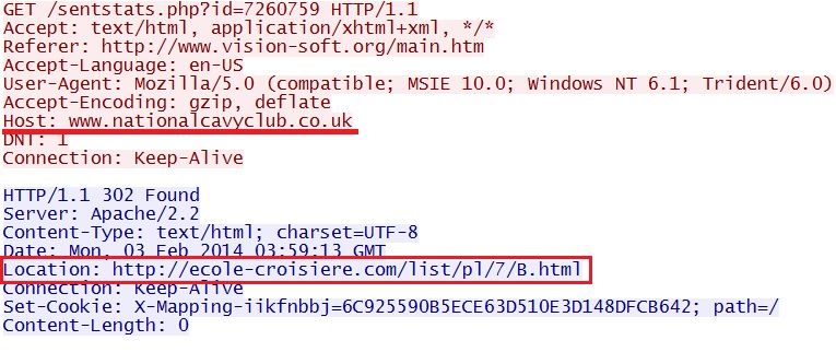 - 03:59:13 UTC - 98.129.229[.]64:80 - www.nationalcavyclub[.]co[.]uk - GET /sentstats.php?id=7260759