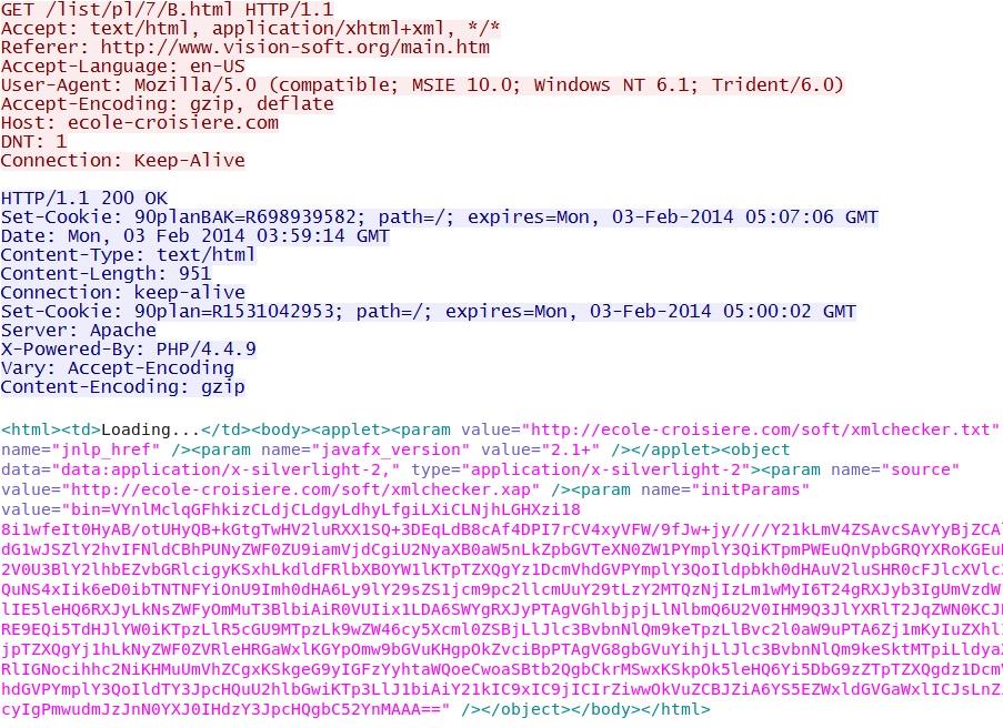 - 2014-02-03 03:59:14 UTC - 213.186.33[.]2:80 - ET CURRENT_EVENTS GoonEK Landing Jan 21 2013 SilverLight 1