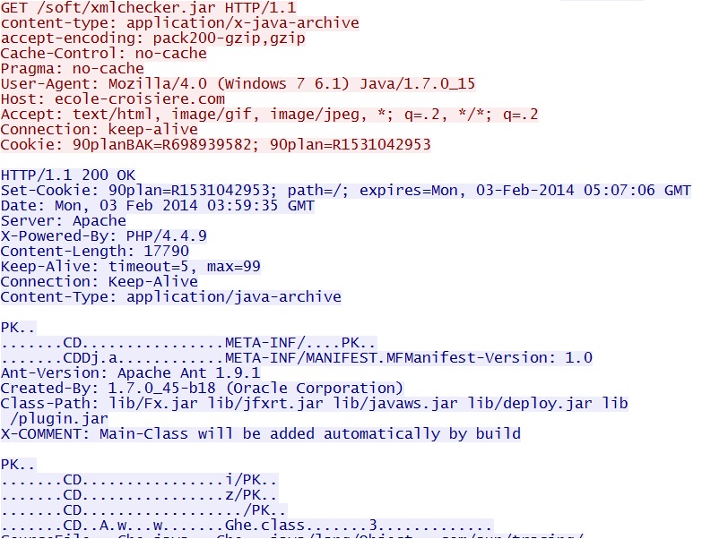 - 03:59:35 UTC - 213.186.33[.]2:80 - ecole-croisiere[.]com - GET /soft/xmlchecker.jar Java exploit (repeated)