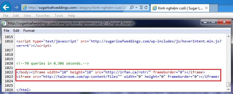 Embedded iframe in the infected web page - sugarloafweddings[.]com/category/kinh-nghiem-cuoi-2/