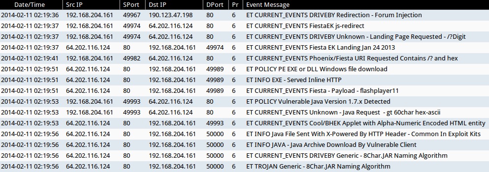 - 2014-02-11 02:19:37 UTC - 64.202.116[.]124:80 - ET CURRENT_EVENTS Fiesta EK Landing Jan 24 2013