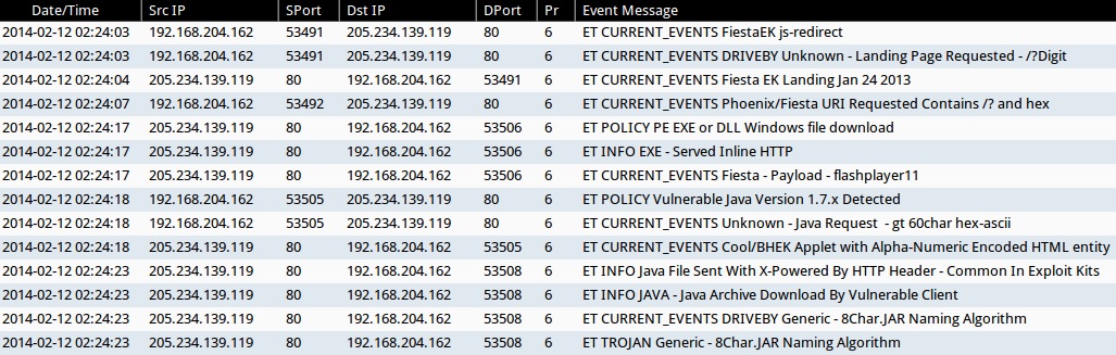 - 2014-02-12 02:24:04 UTC - 205.234.139[.]119:80 - ET CURRENT_EVENTS Fiesta EK Landing Jan 24 2013