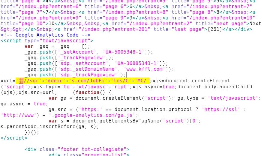 Javascript redirect in the infected web page - www.kffl[.]com/
