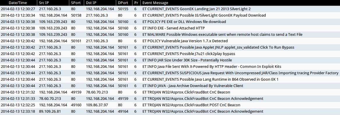 - 2014-02-13 12:30:34 UTC - 217.160.26[.]3:80 - ET CURRENT_EVENTS Possible IE/SilverLight GoonEK Payload Download