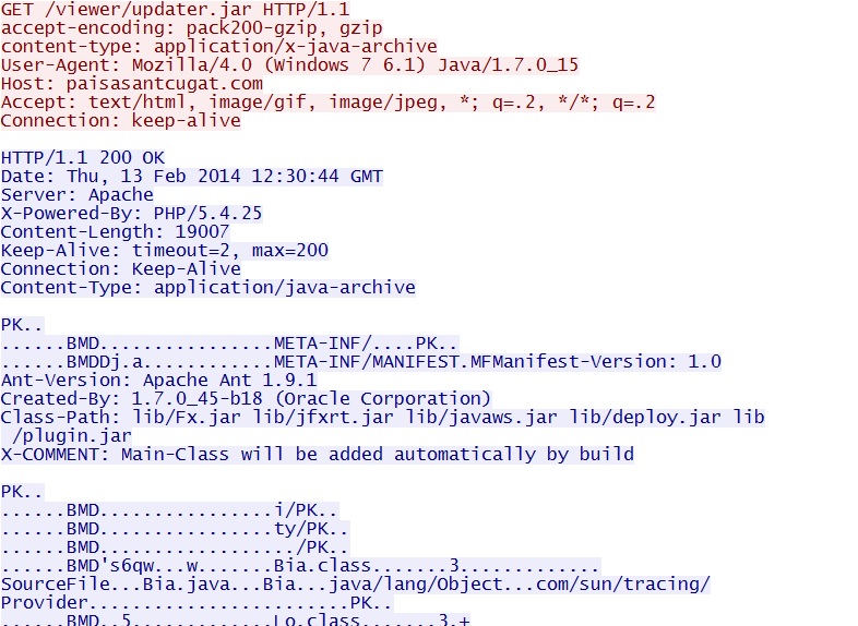 - 12:30:42 UTC - 217.160.26[.]3:80 - paisasantcugat[.]com - GET /viewer/updater.jnlp