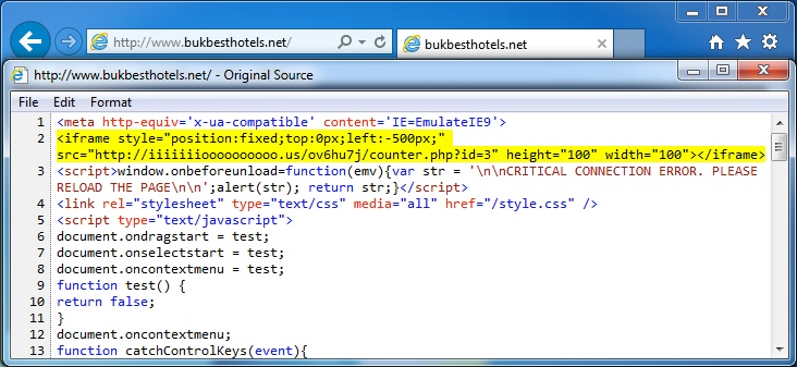 Embedded iframe in the infected web page - www.bukbesthotels[.]net/