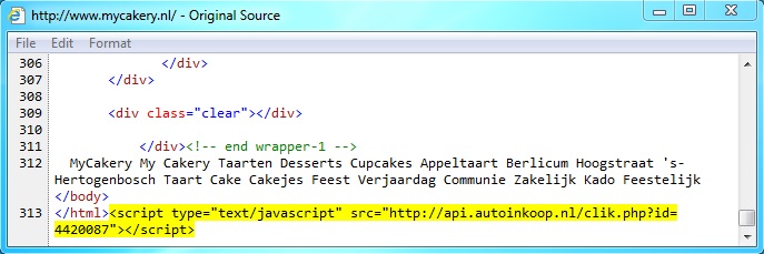 Embedded javascript from the infected web page - www.mycakery[.]nl/