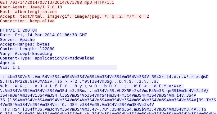 - 01:06:38 UTC - 173.254.28[.]52:80 - albertenglish[.]com - GET /03/14/2014/03/13/2014/675798.mp3