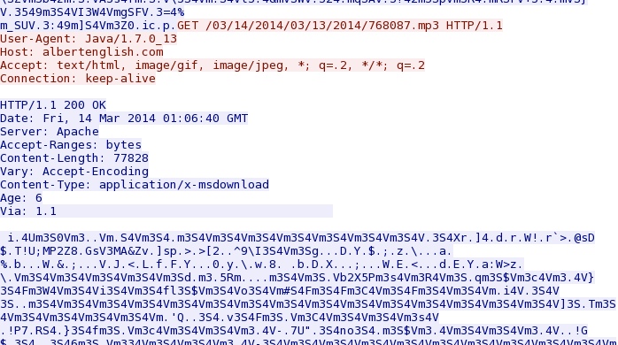 - 01:06:40 UTC - 173.254.28[.]52:80 - albertenglish[.]com - GET /03/14/2014/03/13/2014/768087.mp3