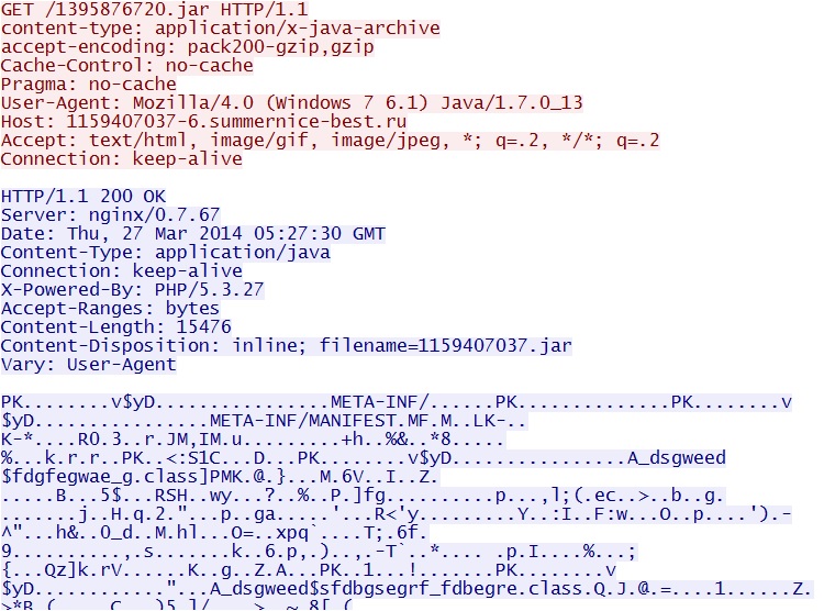 - 2014-03-27 05:26:44 UTC - 198.50.185[.]76:80 - ET INFO JAVA - Java Archive Download By Vulnerable Client