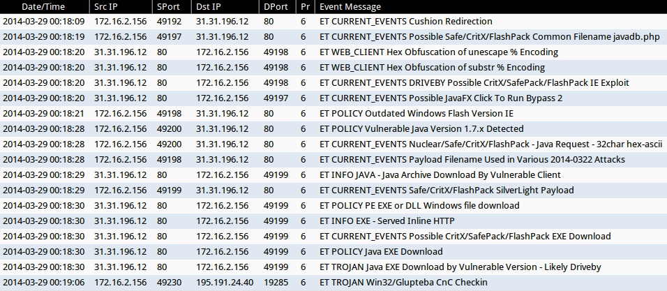 - 2014-03-29 00:18:20 UTC - 31.31.196[.]12:80 - ET CURRENT_EVENTS DRIVEBY Possible CritX/SafePack/FlashPack IE Exploit