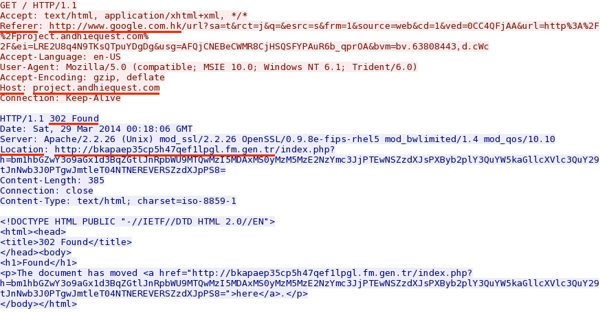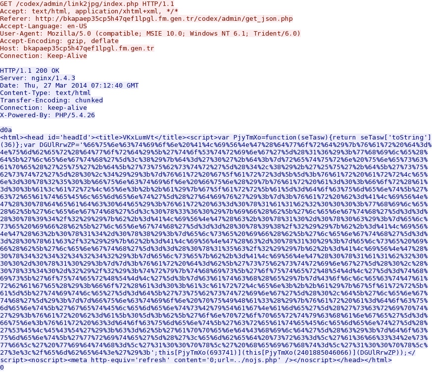 - 19:18:09 UTC - bkapaep35cp5h47qef1lpgl.fm.gen[.]tr - GET /index.php?h=bm1hbGZwY3o9aGx1d3BqZGtlJnRpbWU9MTQwMzI5MDAxMS0yMzM5MzE2NzYmc3JjPTEwNSZzdXJs