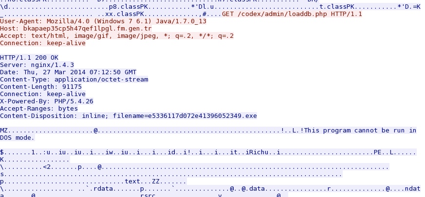 - 19:18:29 UTC - bkapaep35cp5h47qef1lpgl.fm.gen[.]tr - GET /codex/admin/loaddb.php [malware payload from Java exploit]