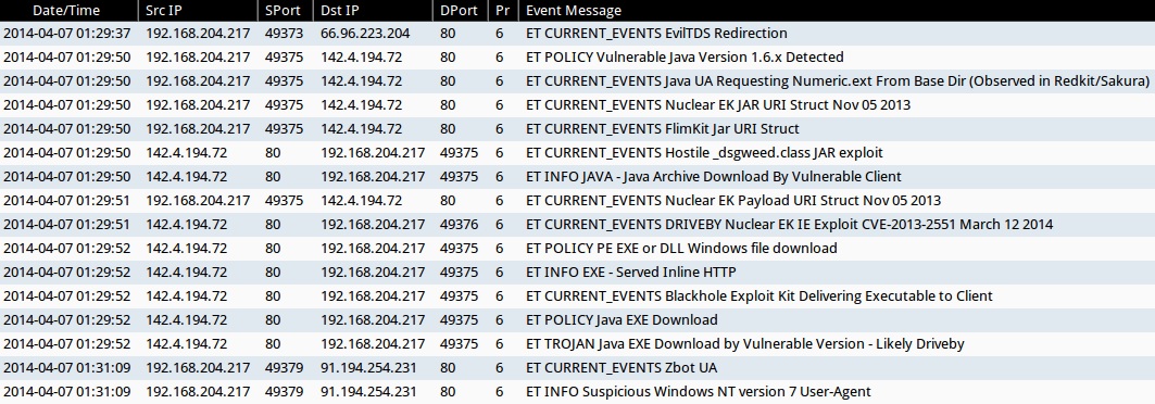 - 2014-04-07 01:29:50 UTC - 142.4.194[.]72:80 - ET CURRENT_EVENTS Nuclear EK JAR URI Struct Nov 05 2013