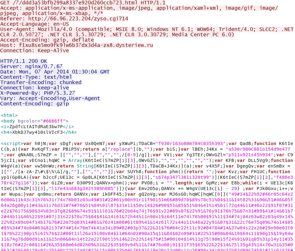 - 01:29:38 UTC - 142.4.194[.]72:80 - f1xu8se5mo9fk9lw6b37dx3d4a-zx8.dysteriew[.]ru - GET /7/ddd3a53bfb299a8337e920d260ccb723.html