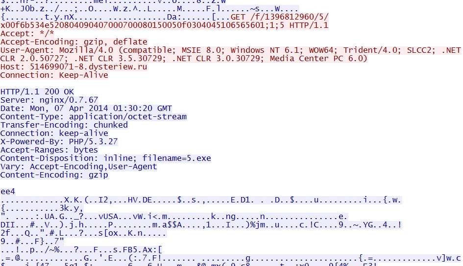- 01:29:54 UTC - 142.4.194[.]72:80 - 514699071-8.dysteriew[.]ru - GET /f/1396812960/5/x00f6b534e520804090407000700080150050f0304045106565601;1;5