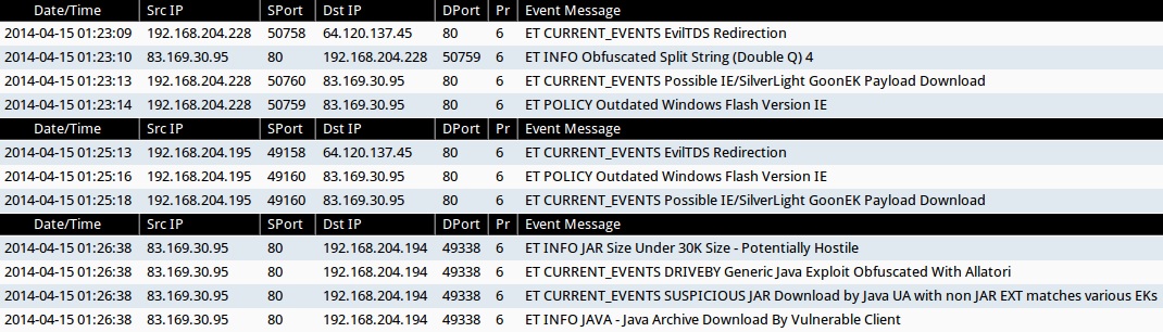 - 2014-04-15 01:23:13 UTC - 83.169.30[.]95:80 - ET CURRENT_EVENTS Possible IE/SilverLight GoonEK Payload Download