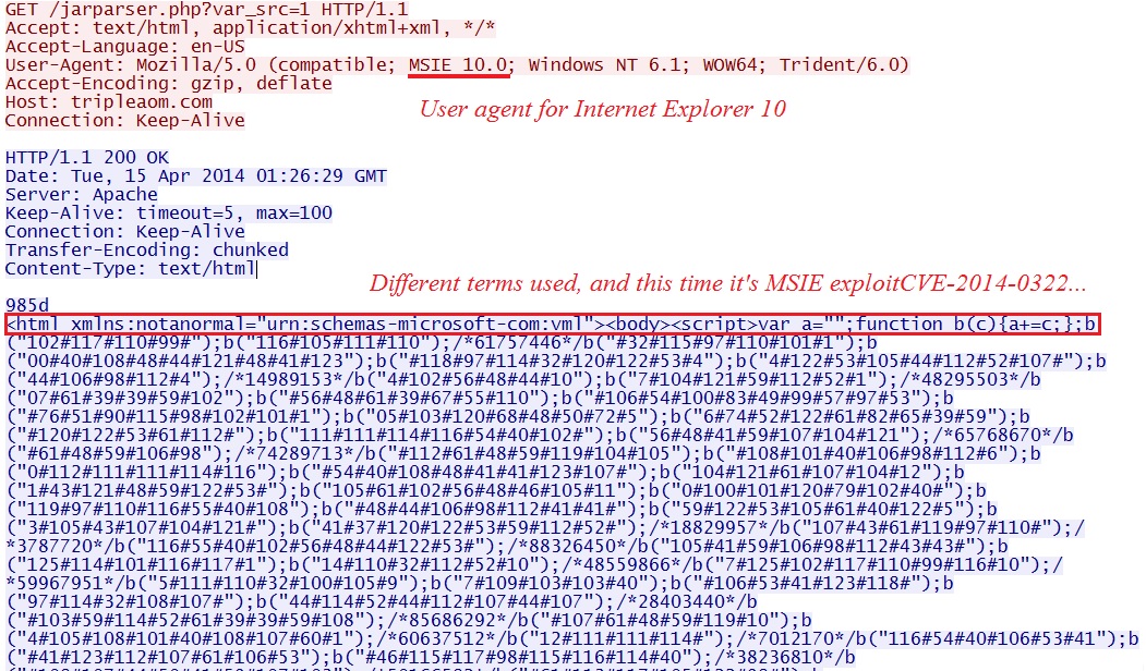Along with the Silverlight exploit, this one sent two Flash files for the CVE-2014-0322 MSIE exploit. This traffic is similar to Kafeine's blog entry on CVE-2014-0322.
