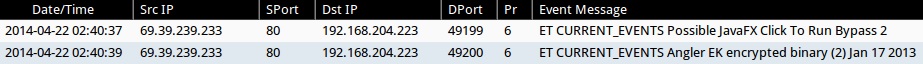 - 2014-04-22 03:03:29 UTC - 69.39.239[.]233:80 - ET CURRENT_EVENTS Possible JavaFX Click To Run Bypass 2