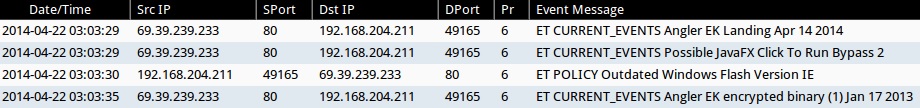 - 2014-04-22 03:03:35 UTC - 69.39.239[.]233:80 - ET CURRENT_EVENTS Angler EK encrypted binary (1) Jan 17 2013