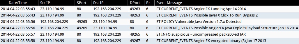 - 2014-04-22 03:55:56 UTC - 23.110.194[.]99:80 - ET POLICY Vulnerable Java Version 1.7.x Detected