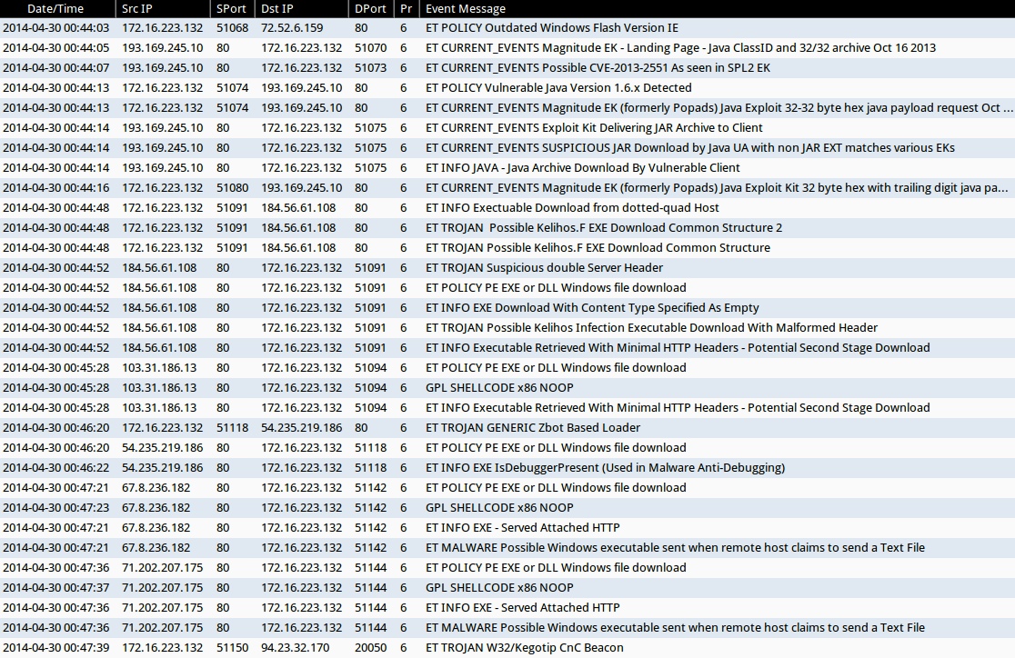 - 2014-04-30 00:44:14 UTC - 193.169.245[.]10:80 - ET CURRENT_EVENTS Exploit Kit Delivering JAR Archive to Client