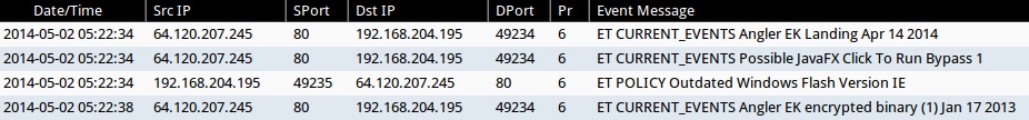 - 2014-05-02 05:22:34 UTC - 64.120.207[.]245:80 - ET CURRENT_EVENTS Angler EK Landing Apr 14 2014