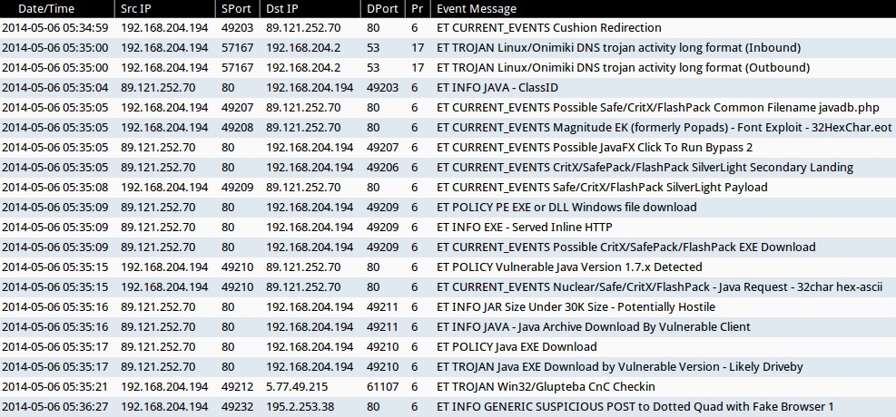 - 2014-05-06 05:35:15 UTC - 89.121.252[.]70:80 - ET CURRENT_EVENTS Nuclear/Safe/CritX/FlashPack - Java Request - 32char hex-ascii