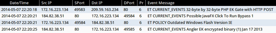 - 2014-05-07 22:20:25 UTC - 184.82.38[.]51:80 - ET CURRENT_EVENTS Angler EK encrypted binary (1) Jan 17 2013