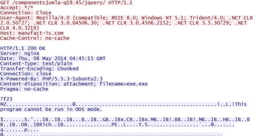- 2014-05-08 04:45:12 UTC - 146.0.43[.]86:80 - ET INFO EXE - Served Inline HTTP