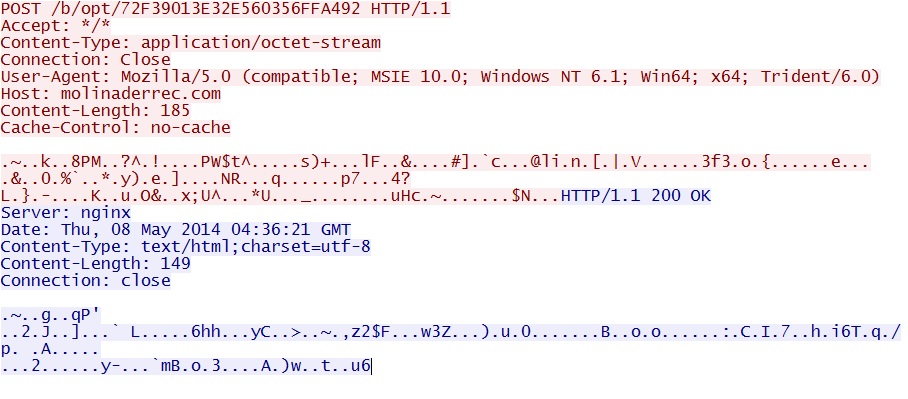 - 04:49:14 UTC - 46.36.30[.]3 - molinaderrec[.]com - POST /b/opt/5119972398FF88292D2E7AB8