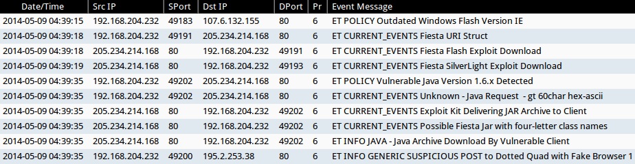 - 2014-05-09 04:39:35 UTC - 205.234.214[.]168:80 - ET CURRENT_EVENTS Exploit Kit Delivering JAR Archive to Client