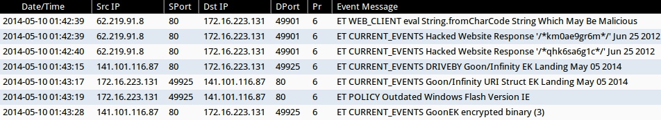 - 2014-05-10 01:43:15 UTC - 141.101.116[.]87:80 - ET CURRENT_EVENTS DRIVEBY Goon/Infinity EK Landing May 05 2014