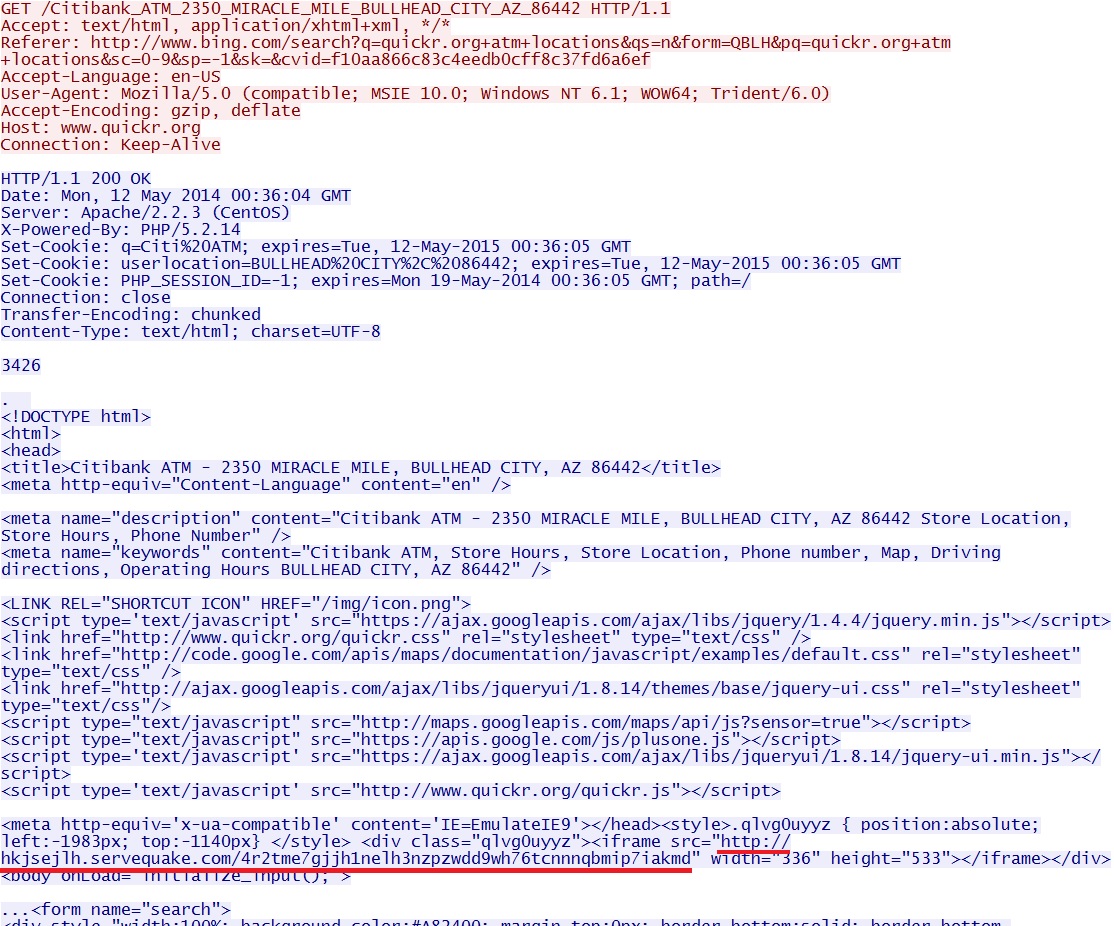 - 00:14:35 UTC - www.quickr[.]org - GET /Citibank_ATM_2350_MIRACLE_MILE_BULLHEAD_CITY_AZ_86442