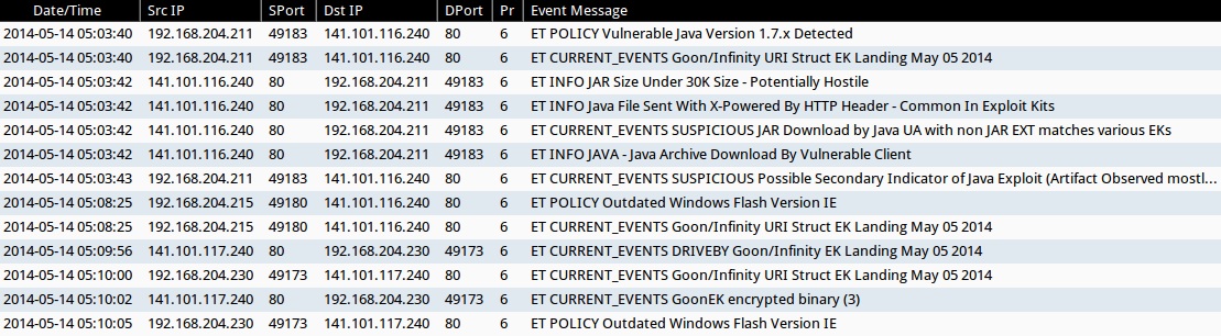 - Snort events in Security Onion are still showing this as Goon/Infinity EK.