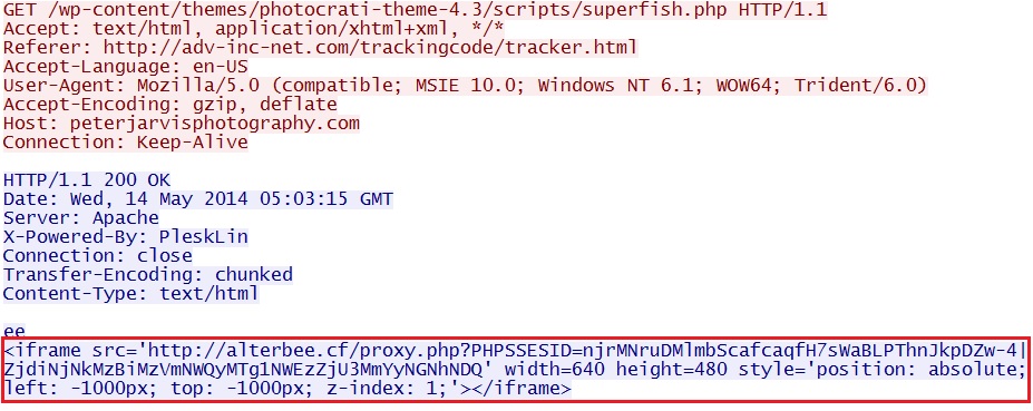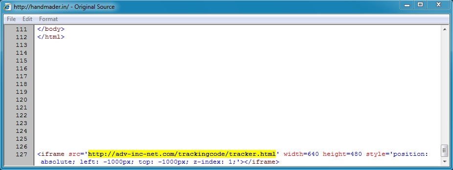 Iframe in page from compromised web server points to adv-inc-net[.]com/trackingcode/tracker.html: