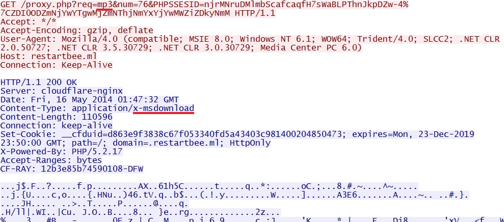 - 01:47:34 UTC - restartbee[.]ml - proxy.php?req=mp3&num=25313&PHPSSESID=njrMNruDMlmbScafcaqfH7sWaBLPThnJkpDZw-4%7CZDI0ODZmNjYwYTgwMjZmNThjNmYxYjYwMWZiZDkyNmM