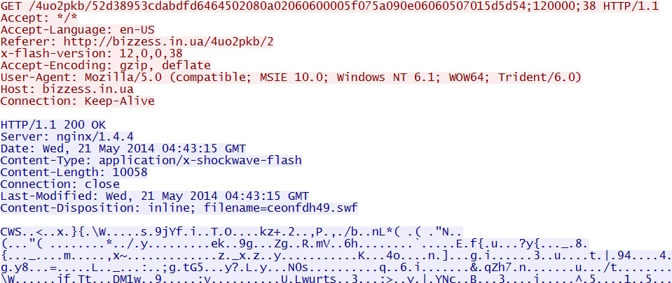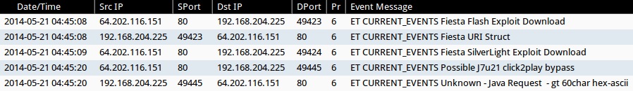 - 2014-05-21 04:45:08 UTC - 64.202.116[.]151:80 - ET CURRENT_EVENTS Fiesta Flash Exploit Download (sid:2018411)