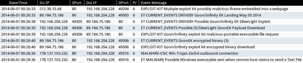 - 2014-06-01 00:26:38 UTC - 89.184.75[.]186:80 - ET CURRENT_EVENTS DRIVEBY Possible Goon/Infinity EK SilverLight Exploit (sid:2018402)