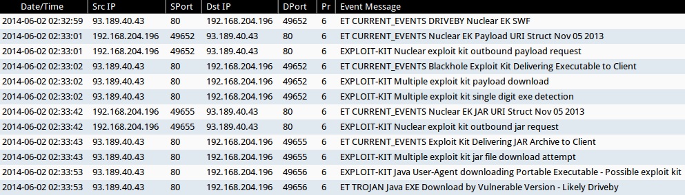 - 2014-06-02 02:33:42 UTC - 93.189.40[.]43:80 - ET CURRENT_EVENTS Nuclear EK JAR URI Struct Nov 05 2013 (sid:2017666)