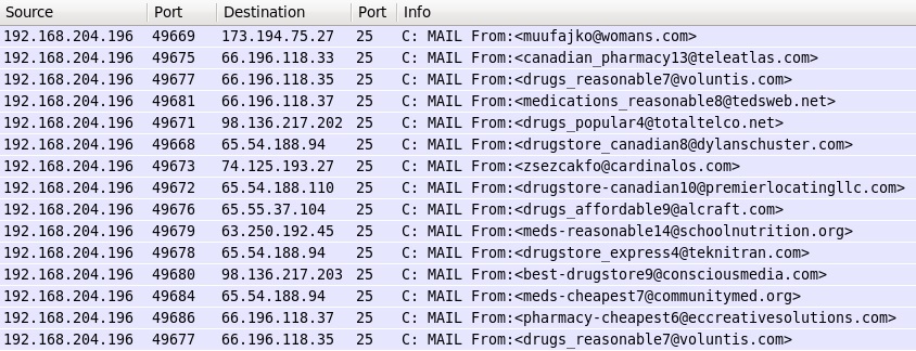 - SMTP traffic on port 25 - pharmacy spam with different spoofed senders: